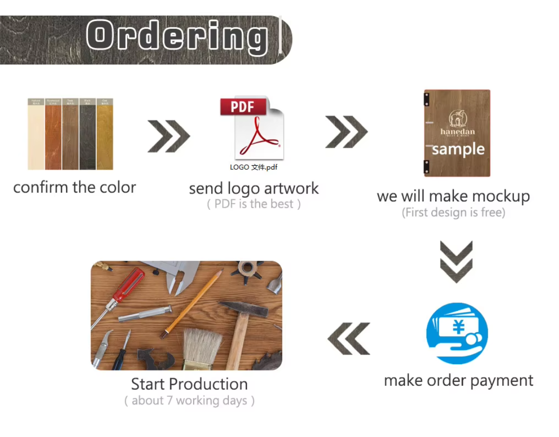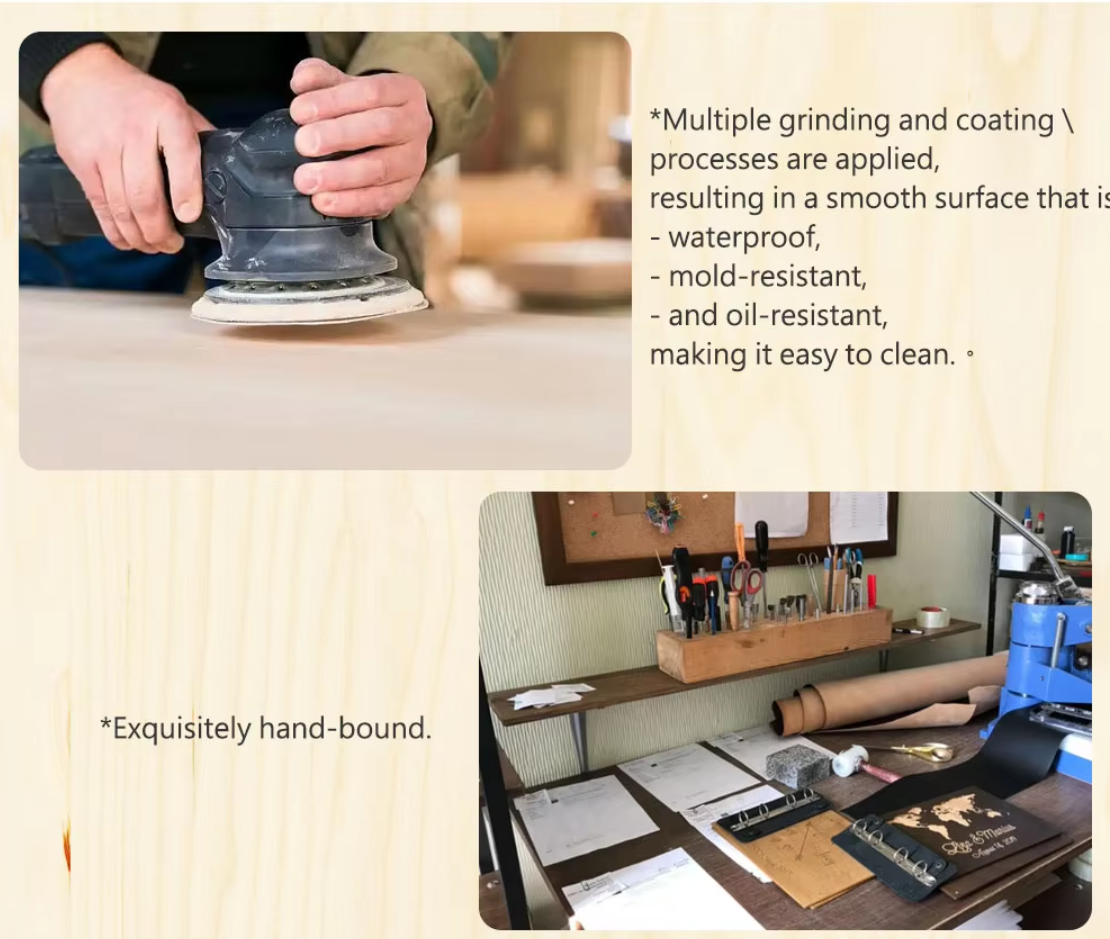 Customizable wooden menu cover made from solid plywood, genuine/faux leather, and rust-proof hardware, available in A4 size or customized options. Features include 5 color choices, logo engraving, UV printing, and loose-leaf binding, perfect for restaurants seeking a modern handmade aesthetic.